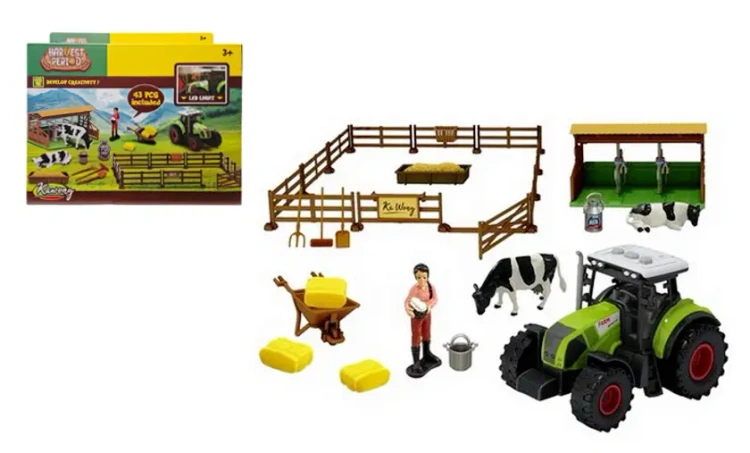 Zestaw farmerski wraz z krowami, opiekunem zwierząt, taczką, traktorem, przyczepą, zagrodą oraz akcesoriami do sprzątania i karmienia zwierząt. Łącznie 43 elementów. Traktor świeci kolorowym światełkiem. Wybrane elementy zestawu działają na baterie typu AG13. Baterie znajdują się w zabawce. Produkt zapakowany w kartonowe opakowanie. Zabawka dla dzieci od 3 lat. Podane wymiary są wymiarami opakowania.