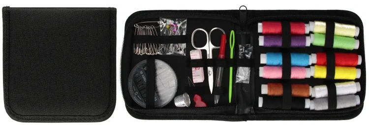 Przenośny zestaw narzędzi do szycia dla domu, oferujący szeroki zestaw podstawowych narzędzi.