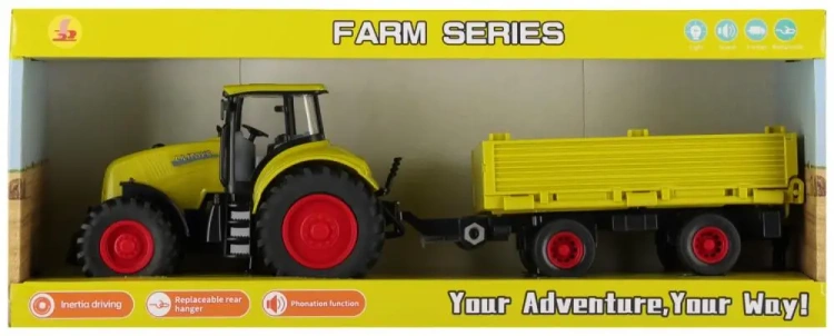 Zalety produktu pojazd posiada efekty dźwiękowe oraz świetlne, posiada odczepianą przyczepę, traktor posiada funkcję pull&back dzięki czemu po pchnięciu pojazdu do przodu kontynuuję jazdę samodzielnie oraz gumowe koła.