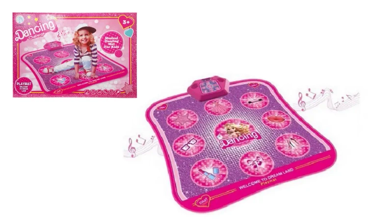 Muzyczna mata do tańca w kolorze różowym. Po naciśnięciu odpowiednich pól wydaje dźwięki i melodie, których głośność można regulować. Mata świeci także kolorowym światełkiem. Produkt działa na baterie AA. Baterie nie są załączone do zabawki. Zabawka przeznaczona dla dzieci od lat 3. Zabawka zapakowana w kartonowe pudełko. Podane wymiary są wymiarami opakowania.