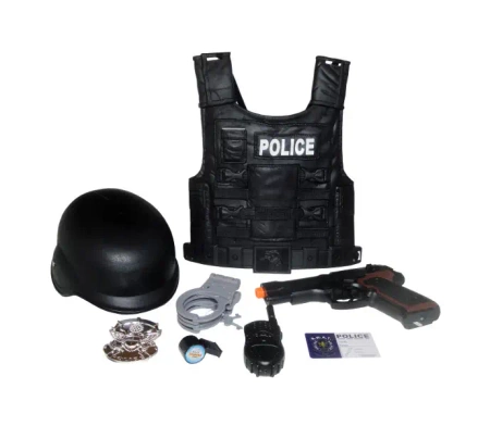 Zabawka z dźwiękami syreny policyjnej, strzelania, przeładowania broni oraz komendami policyjnymi w języku polskim: "Do wszystkich jednostek: Zgłaszam napad, ruszajmy do akcji", "Policja! Ręce do góry", "Stój, bo będę strzelał", "poddaj się, rzuć broń! Jesteś otoczony", "Jesteś aresztowany, jedziemy na komendę". W zestawie oprócz pistoletu znajduje się także m.in.: kask, kajdanki, odznaka, kamizelka oraz krótkofalówka.