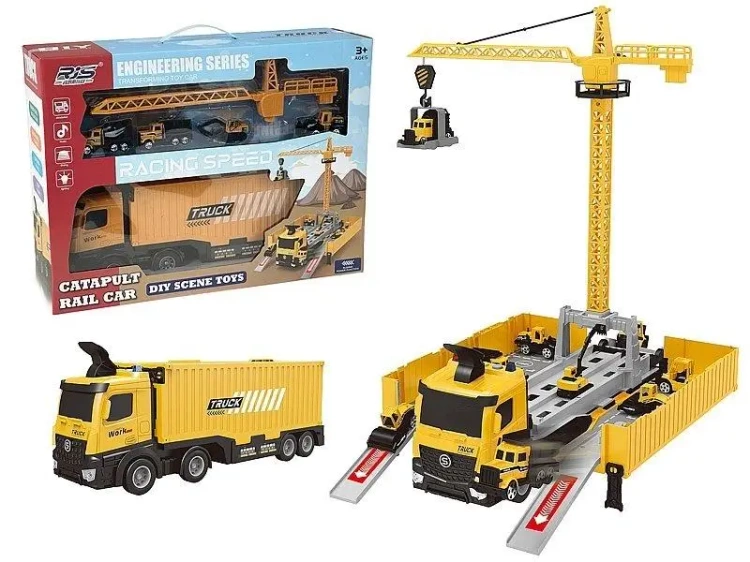 auto ciężarowe z rozkładaną naczepą, tworzącą plac budowy, z dźwigiem, 4 autka, światło, dźwięk, bat.2xAA niedołączone; 49x36,5x14cm