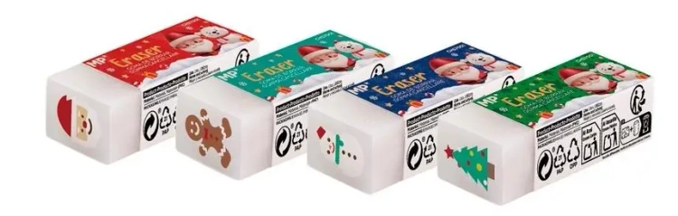 Gumka do ścierania z PVC, wymiary: 592114 cm, waga ok. 24g. Wydruk na papierze 210g, opakowanie OPP z paskiem do zrywania. 36 sztuk w pudełku, 4 różne wzory świąteczne. Dobra wymazywalność.