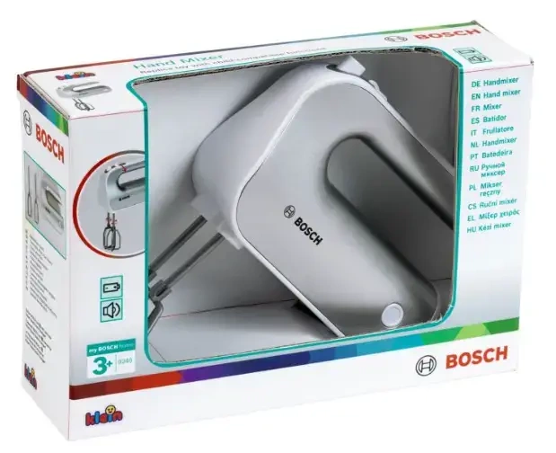 KL 9240 Mikser Bosch Srebrny Mikser Klein powstał na licencji Bosch, dlatego też są wierną kopią prawdziwego urządzenia produkowanego przez tę firmę. Firma Klein od lat produkuje odpowiedniki prawdziwych narzędzi i akcesoriów AGD, przeznaczone do zabawy dla najmłodszych. Mikser jest w kolorze srebrnym. Zabawka jak prawdziwa, ma obracane mieszadła, które włącza się za pomocą przycisku. Do właściwego funkcjonowania zabawki niezbędne jest użycie baterii, które nie są częścią zestawu. Dodatkowo mikser posiada ruchomy przełącznik będący imitacją regulacji prędkości pracy miksera. Ponadto mieszadła po skończonej zabawie można zdemontować i jak prawdziwe umyć. Ważną zaletą zabawki jest nie tylko jej pełna funkcjonalność, ale również gwarancja bezpieczeństwa, gdyż wszystkie elementy zostały wykonane z plastiku. Materiały, są najwyższej jakości, a także bezpieczne dla dziecka. Zabawka pozwoli każdemu dziecku na naśladowanie rodziców w sposób bezpieczny i pełen dobrej zabawy. Wielkość wszystkich elementów i akcesoriów zestawu jest dopasowana do potrzeb i rączek dziecka. Zabawka z pewnością będzie również świetnym uzupełnieniem pozostałych zestawów kuchennych firmy Klein. Specyfikacja: Produkt jest zabawką Zabawka przeznaczona dla dzieci powyżej 3 roku życia Waga : 0,2 kg Wymiary opakowania : 19x7x12 cm Wymagane baterie : 1 x R6 (AA) Ilość w opakowaniu zbiorczym : 6 Kraj pochodzenia : Chiny Seria zabawek AGD firmy KLEIN realistycznie odzwierciedla prawdziwe urządzenia wprowadzone na rynek przez najbardziej znane i jakościowo najlepsze marki produktów. Dla małych gospodyń domowych to niesamowita atrakcja! Dzieci z chęcią uczą się pomagać w wykonywaniu domowych czynności jednocześnie świetnie się przy tym bawiąc. Każdy ze sprzętów kuchennych pomoże w przygotowaniu zarówno małej przekąski jak i wykwintnego przyjęcia dla lalek lub koleżanek. Dodatkową zaletą tych zabawek jest to, że ich kolorystyka jest odpowiednia dla dziewczynek oraz dla chłopców.