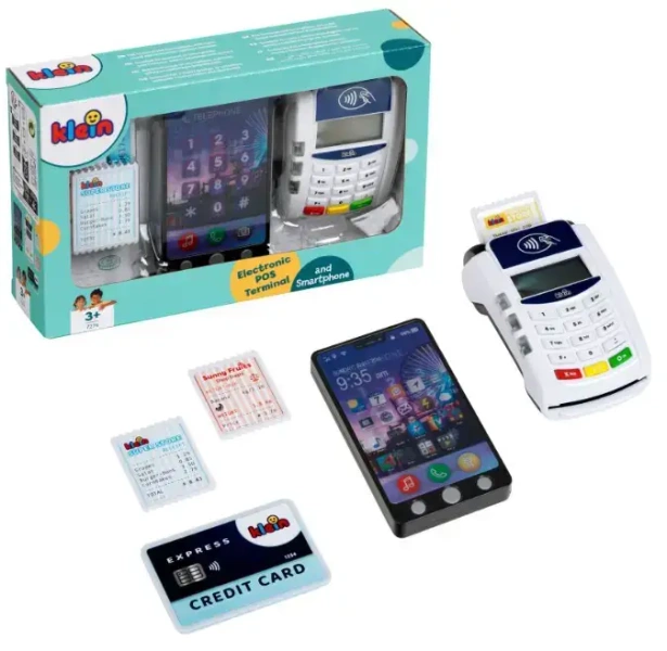 Klein 7274 Terminal ze smartfonem Z terminalem ze smartfonem od Klein mali sprzedawcy staną się profesjonalistami w odgrywaniu ról! Zestaw zawiera realistyczny terminal PoS, w którym można dokonywać płatności kartą kredytową lub smartfonem. Gniazdo na kartę kredytową z towarzyszącym dźwiękiem zapewnia autentyczną zabawę. Dołączony smartfon zachwyca 3 przyciskami z różnymi dźwiękami i latarką funkcja płatności zbliżeniowych dopełnia zabawę. Dzięki akcesoriom, takim jak karty paragonowe i karta kredytowa, dzieci mogą nauczyć się korzystać z nowoczesnej technologii płatności w zabawny sposób. 7-częściowy zestaw zawiera terminal PoS, dziecięcy telefon komórkowy z funkcjami światła i dźwięku, kartę kredytową z funkcją płatności zbliżeniowych oraz trzy karty paragonowe idealne do pomysłowej zabawy w odgrywanie ról. Zabawka wspomaga wyobraźnię, sprawność motoryczną i umiejętności niezbędne we wczesnym dzieciństwie poprzez zabawne zakupy i płatności Specyfikacja: Wymiary: 20 cm x 12 cm x 5 cm Odpowiedni dla dzieci w wieku od 3 lat Wymagane baterie: 6x R03-AAA (Micro) brak w zestawie