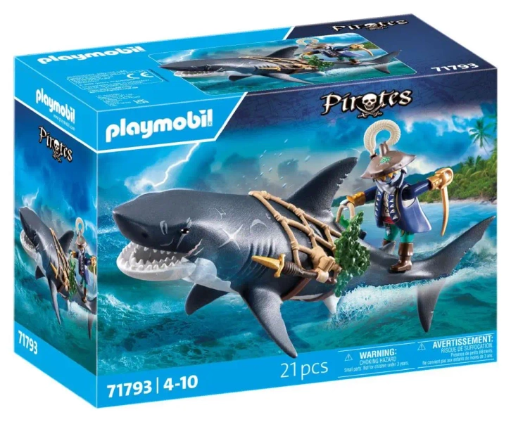 Rekin olbrzym z piratem! Ten przerażający duet sieje postrach na dalekich morzach. Zamykająca się szczęka gigantycznego rekina może uwięzić z nienacka zdobycz, podczas gdy odważny pirat trzyma się sieci, uzbrojony w sztylety i gotowy do walki. Dzięki broni doczepianej do sieci i pływającemu rekinowi akcja zatacza coraz większe kręgi.