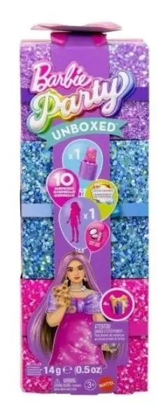 Odkryj 10 niespodzianek w jednym zestawie Lalka Barbie Party Unboxed Glam Party Stylowe przygotowania schowana w opakowaniu inspirowanym pudełkiem na prezent zapewnia niezapomniane wrażenia z rozpakowywania oraz zabawę stylem. Na początek odkryj lalkę modową Barbie i zdejmij jej ręcznik z włosów oraz maseczkę z twarzy. Którą lalkę znajdziesz? W tej serii dostępne są trzy lalki, każda z niepowtarzalną stylizacją. Otwieraj dalej, aby znaleźć więcej niespodzianek schowanych w opakowaniu. Za pomocą dołączonego pędzelka przebij każdą sekcję pojemniczka-paletki i zachwyć się ukrytymi akcesoriami dla lalki Barbie. Potem wyjmij tubkę szminki z żelem i zgnieć go, by znaleźć zwierzątko. Na koniec przekręć ręcznik Barbie na drugą stronę, odsłaniając imprezową sukienkę, i wyszykuj lalkę na przyjęcie dzięki zgromadzonym akcesoriom. Wśród innych niespodzianek jest zmiana koloru na twarzy i włosach lalki. Aby ją zobaczyć, wystarczy użyć ciepłej lub bardzo zimnej wody i podziwiać magiczną transformację. Tę niezwykłą zabawę można powtarzać wciąż od nowa. Dzieci pokochają odkrywanie niespodzianek, dzięki którym lalka Barbie może przygotować się na przyjęcie – mogą zebrać wszystkie lalki z serii Barbie Party Unboxed, aby imprezowa zabawa nie miała końca. Lalki są sprzedawane oddzielnie, zależnie od dostępności. Lalki nie stoją samodzielnie. Kolory i elementy dekoracyjne mogą się różnić.
