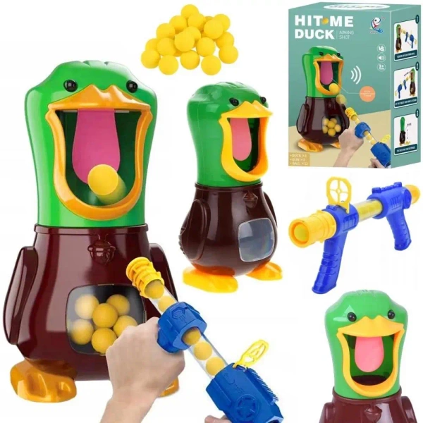 Licznik Trafień: Z boku kaczki znajduje się przezroczysty pojemnik, który zbiera trafione piłeczki. Można łatwo zliczyć trafienia i sprawdzić, kto jest najlepszym strzelcem!