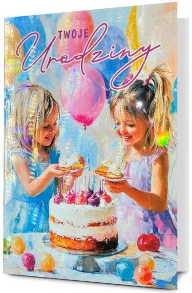Kartka jest zdobiona opalizującą folią holograficzną, zawiera życzenia oraz kolorowy środek. W zestawie znajduje się koperta, kolorystycznie uzupełniająca się z kartką. Format złożonej kartki: B6