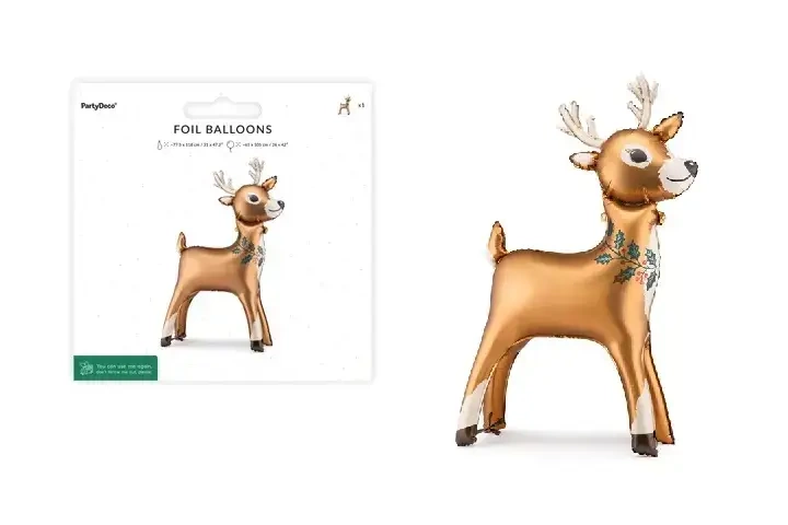 Uroczy balon foliowy w kształcie renifera, idealny na świąteczne dekoracje i imprezy zimowe. Przed napompowaniem ma wymiary około 77,5 x 118 cm, natomiast po napompowaniu mierzy około 65 x 105 cm. Balon jest wykonany z trwałego materiału, który pozwala mu stabilnie stać. Doskonały dodatek, który wprowadzi świąteczny nastrój do każdego wnętrza.