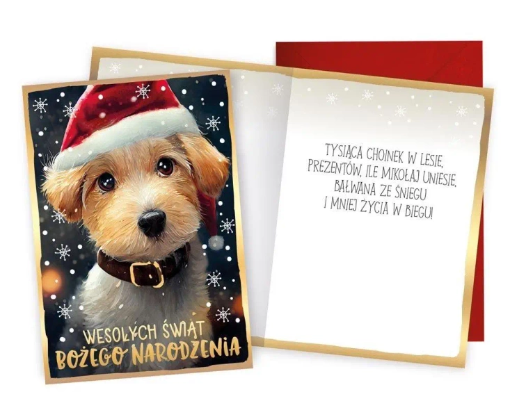 Kartka wielkości B6, zdobiona w zależności od wzoru metaliczną folią lub brokatem. Każda kartka posiada kolorowe życzenia w środku i dopasowaną kopertę w komplecie. Wymiary karnetu po złożeniu: 11,7 x 16,6 cm.