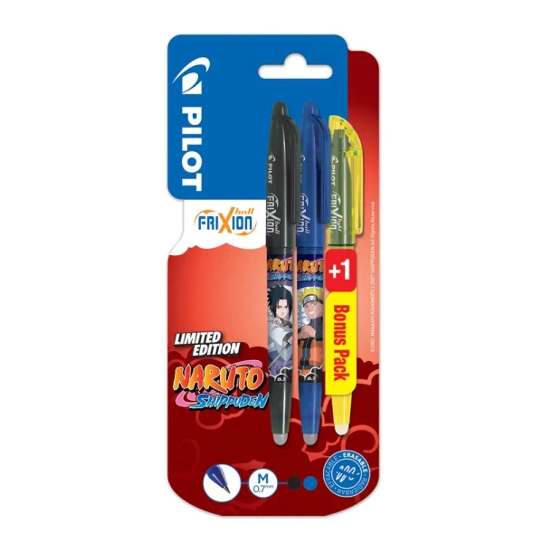 Pióro kulkowe Frixion Ball Naruto Pilot niebieskie + czarne + zakreślacz Frixion light żółty blister - PILOT