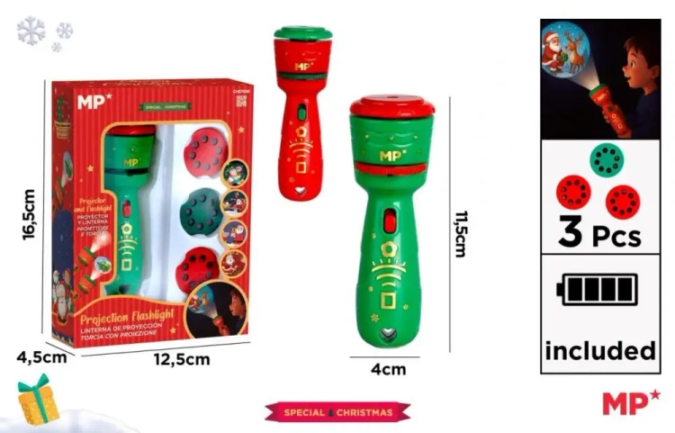 Dostarczana z 3 tarczami projekcyjnymi z nadrukowanymi motywami świątecznymi i 3 bateriami guzikowymi.