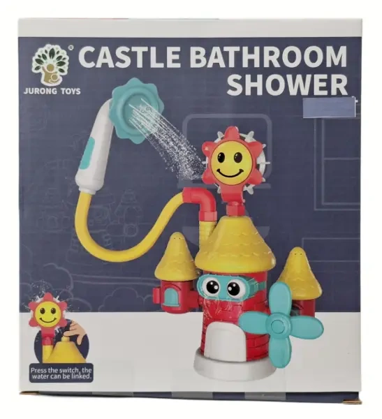 Kolorowa zabawka do kąpieli w kształcie zamku. Posiada prysznic z obiegiem wody uruchamiany przyciskiem. Elementy wesoło się obracają podczas zabawy.