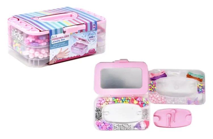 Zestaw kreatywny do tworzenia biżuterii ponad 400 kolorowych koralików, sznureczki i akcesoria. Wszystko umieszczone w poręcznym, zamykanym pudełku z uchwytem.
