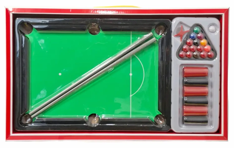 Bilard stołowy. Zestaw bilardowy w małym formacie stół, bile, trójkąt i dwa kije. Idealny do zabawy w domu.