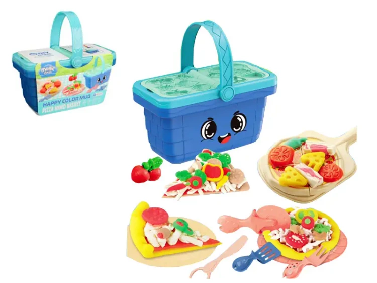 Zestaw kreatywny z ciastoliną do tworzenia pizzy i dodatków. W komplecie koszyk z pokrywką, foremki, narzędzia i kolorowe masy plastyczne.
