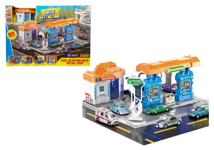 Stacja benzynowa z samochodami. Zestaw z budynkiem stacji paliw, dystrybutorami i samochodami. W komplecie akcesoria drogowe i elementy do samodzielnego złożenia.