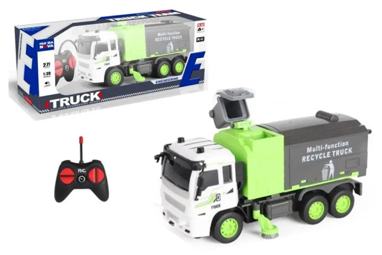 Śmieciarka zdalnie sterowana. Pojazd z funkcją podnoszenia pojemnika i ruchomymi elementami. Sterowanie pilotem, efekty świetlne i dźwiękowe.