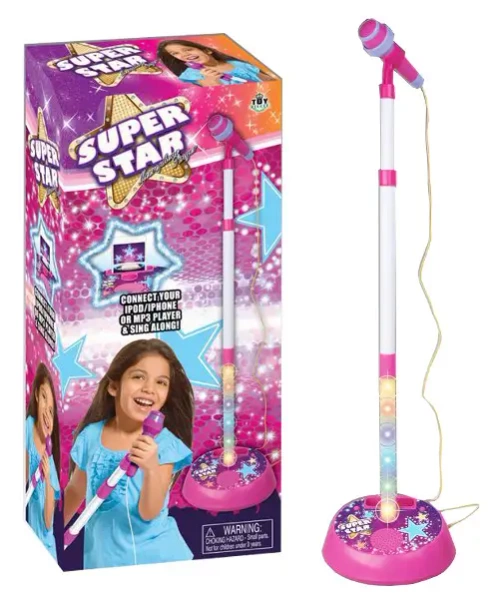 Mikrofon na statywie Superstar. Zabawka muzyczna z mikrofonem i stojakiem. Możliwość podłączenia telefonu lub odtwarzacza MP3. Posiada efekty świetlne i dźwiękowe.