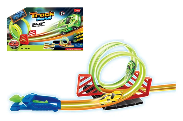 Tor samochodowy z pętlą 360°. Zestaw torów z dwiema pętlami i samochodzikiem. Zabawka zapewnia emocjonującą zabawę w wyścigi.