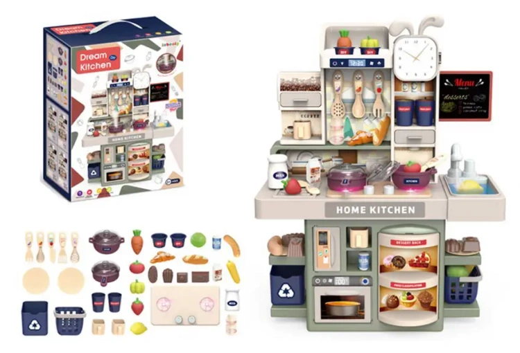 Zestaw kuchenny z wieloma elementami: garnki, talerzyki i produkty spożywcze. Kuchnia posiada zegar, półki i imitacje sprzętów kuchennych. Zabawka zawiera elementy świetlne. Kuchnia ma cykliczny system wody.