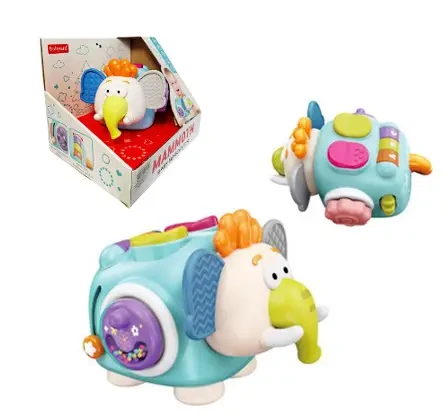 Interaktywna zabawka w kształcie słonia z kolorowymi elementami do obracania, przesuwania i wciskania. Zabawka rozwija zdolności manualne i koordynację wzrokowo-ruchową dziecka. Produkt zapakowany w kartonowe pudełko. Podane wymiary są wymiarami opakowania.