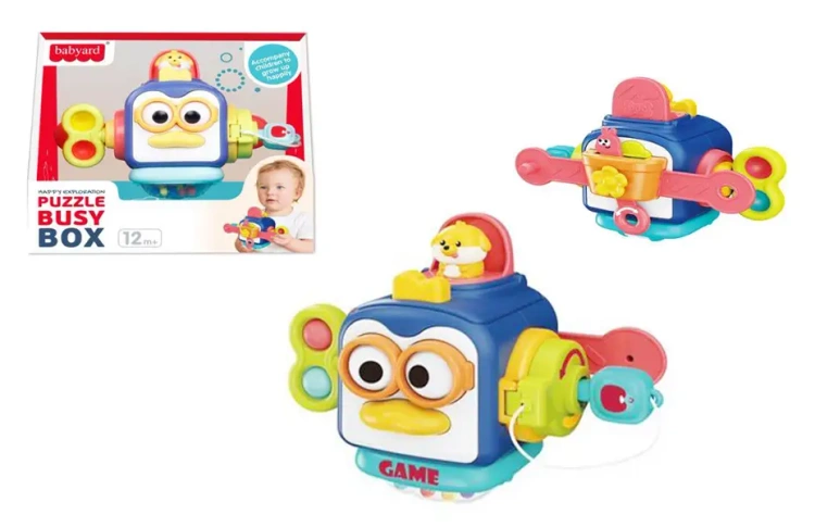 Interaktywny sześcian edukacyjny Puzzle Busy Box z różnymi elementami do wciskania, przekręcania i dopasowywania. Posiada kolorowe przyciski i ruchome części, które stymulują zmysły dziecka oraz rozwijają zdolności poznawcze. Produkt zapakowany w kartonowe pudełko. Podane wymiary są wymiarami opakowania. Zabawka przeznaczona dla dzieci od pierwszego roku życia.