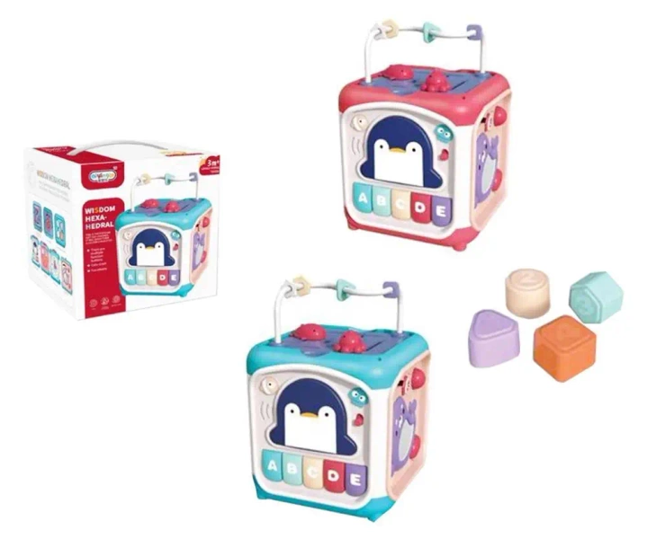 Edukacyjna kostka interaktywna z kolorowymi elementami i sorterem kształtów. Każda ścianka oferuje inną aktywność: przesuwanie koralików, dopasowywanie kształtów czy wciskanie przycisków. Dostępna w dwóch wersjach kolorystycznych, kolor wybierany losowo. Produkt zapakowany w kartonowe pudełko. Podane wymiary są wymiarami opakowania. Zabawka przeznaczona dla dzieci od 3 miesiąca życia. Zabawka działa na baterie AA. Baterie nie są załączone do zabawki.