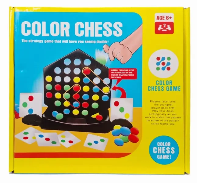 Gra logiczna Color Chess polegająca na układaniu kolorowych krążków zgodnie z wzorami z kart. Pomaga rozwijać logiczne myślenie, koncentrację i spostrzegawczość. W zestawie plansza, kolorowe krążki i karty z zadaniami. Produkt zapakowany w kartonowe pudełko. Podane wymiary są wymiarami opakowania. Zabawka przeznaczona dla dzieci od 6 lat.