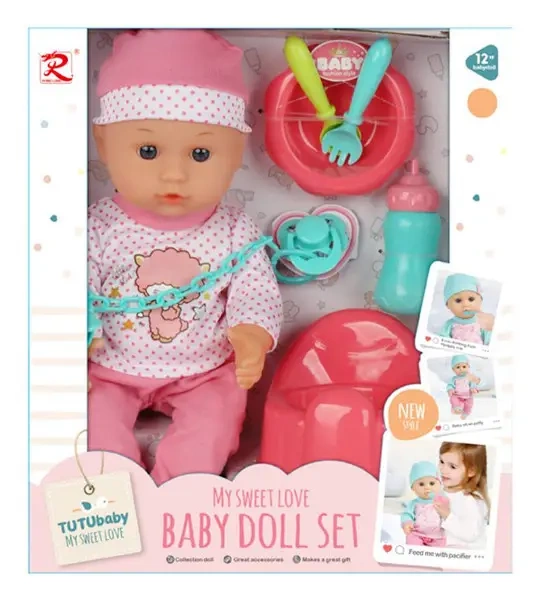 Lalka bobas dla każdego dziecka. Wykonana z dbałością o detale. Idealna do zabawy w opiekę i naśladowanie codziennych czynności dorosłych. W zestawie znajduję się m.in.: lalka, smoczek, butelka, nocnik, miska. Lalka ssie smoczek, siada na nocniku, może jeść. Produkt zapakowany w kartonowe pudełko. Podane wymiary są wymiarami opakowania.