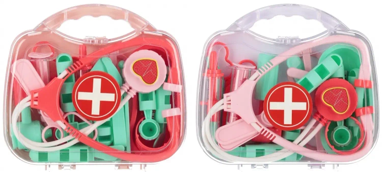 Zalety produktu Zestaw lekarski MEGA CREATIVE w walizce to świetny pomysł na wspaniałą zabawę w lekarza. Pozw oacute l twojemu dziecku przenieść się w świat dorosłego życia i pozwolić wykonywać mu zaw oacute d o kt oacute rym zawsze marzyło Ten podręczny zestaw w zamykanej walizeczce z rączką pomieści wszystkie niezbędne akcesoria lekarskie. Zawartość zestawu stetoskop, miseczka na narzędzia, otoskop, peseta2x nożyczki, szczypce, strzykawka, prob oacute wka, 4x przyrządy lekarskie, plaster, okulary. Całość wykonana z plastiku. Zestaw występuje w dw oacute ch kolorach. Uwaga wysyłka losowo. Wymiary/waga/baterie Wymiary opakowania dł. x wys. x gł. cm 19x18x5, waga opakowania kg. 0,23 kg. Wymiary produktu dl. x wys. x gł. cm -otoskop 4x9x3, waga produktu bez opakowania kg. 0,12 kg. Przeznaczony dla dzieci w wieku 3 . Pakowany w walizce. Nie wymaga zasilania bateriami. W kartonie zbiorczym po 48/96 szt.