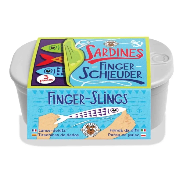 Trzy małe, lepkie gumowe sardynki można naciągnąć palcem i wystrzelić – dla zabawy w biurze, w domu lub na następnej imprezie.