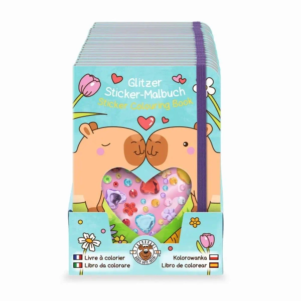 Zawartość: 20 stron pełnych obrazków do pokolorowania z wcześniej pokolorowanymi obszarami brokatowymi, 4 strony z łącznie 98 naklejkami z efektami metalicznymi i brokatowymi oraz 1 strona z wieloma naklejkami z diamentami. W zestawie praktyczne zapięcie z gumką.