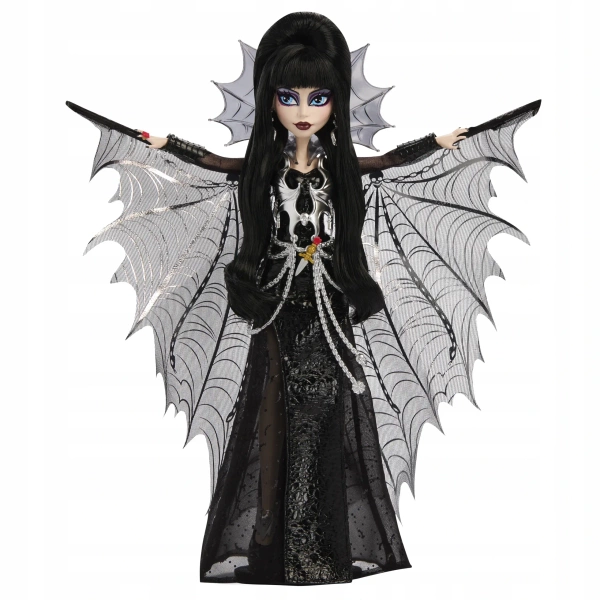 W interpretacji Monster High lalka Elvira zachwyca swoją gotycką elegancją i niepokornym wdziękiem. Ma hipnotyzujące spojrzenie, wyrazisty makijaż i i burzę czarnych włosów spiętą w imponujący kok. Ubrana jest w długą czarną suknię z imitacji skóry, ozdobioną srebrnym gorsetem, który nieco przypomina zbroję. W rozcięciach sukni prześwituje delikatny, tiulowy materiał. Peleryna w kształcie skrzydeł nietoperza rozpościera się za lalką niczym cień – dodając postaci majestatu i dramatyzmu. Kreację dopełnia upiorna biżuteria: pierścień z ogromnym czerwonym oczkiem i kolczyki w kształcie węża. Wszystko to zamknięte w eleganckim pudełku inspirowanym słynnym samochodem Elviry – Macabre Mobile.