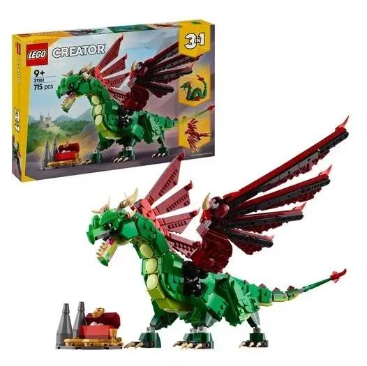 Zachwyć małego podróżnika w czasie tym zestawem LEGO(R) Creator Średniowieczny smok (31161). Zestaw zawiera figurkę smoka, która pozwala dziewięciolatkom i starszym dzieciom odgrywać ekscytujące średniowieczne historie. Ma ona parę dużych ruchomych skrzydeł, które poruszają się i składają, a także ruchome kostki, palce u stóp, szyję, pysk, biodra i ręce. Zestaw zawiera również skrzynię ze skarbami, która poszerza możliwości zabawy.