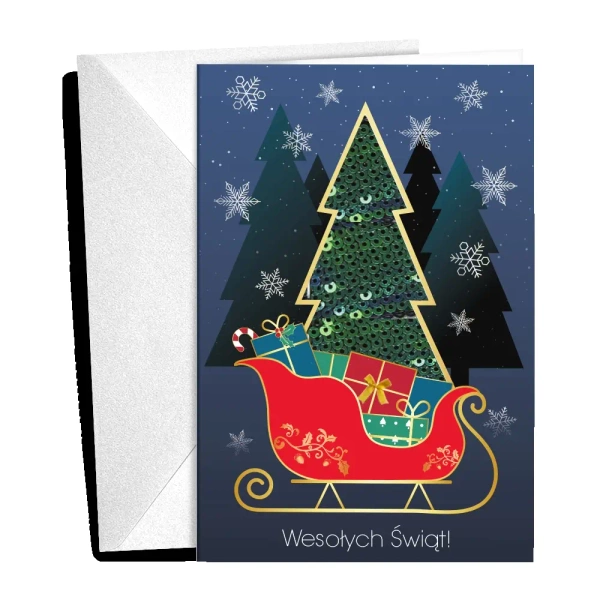 Kartka z życzeniami z dopasowaną kolorystycznie kopertą. Ozdobę stanowią cekiny, złocenie i elementy 3D. Całość zabezpieczona folią typu"open".d