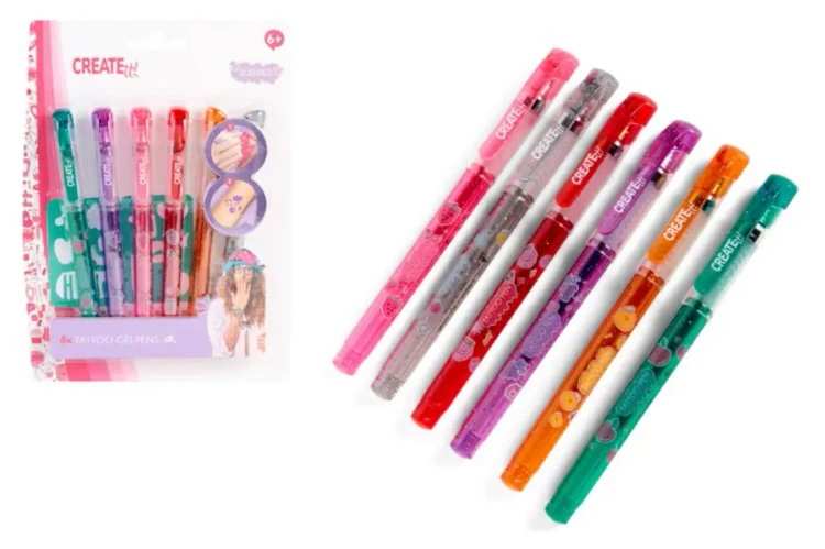 Zestaw kolorowych, pachnących długopisów żelowych do tworzenia tymczasowych tatuaży na skórze. W komplecie znajduje się 6 długopisów w różnych kolorach oraz szablony do rysowania wzorów. Idealny zestaw kreatywny dla dzieci, które lubią ozdabiać swoje rysunki i ciało.