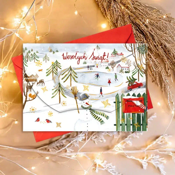 Karnet świąteczny poziomy, składany na kształt koperty w formacie B6, złocony z kopertą ochronną w zestawie.