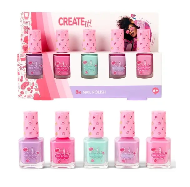 Stwórz swój własny manicure marzeń z zestawem lakierów do paznokci CREATE IT!! Ten wyjątkowy 5-pak to idealna propozycja dla młodych stylistek, które uwielbiają eksperymentować z kolorami i tworzyć niepowtarzalne stylizacje. Każda buteleczka kryje w sobie intensywny kolor o błyszczącym wykończeniu, który doda paznokciom uroku i wyrazistości.