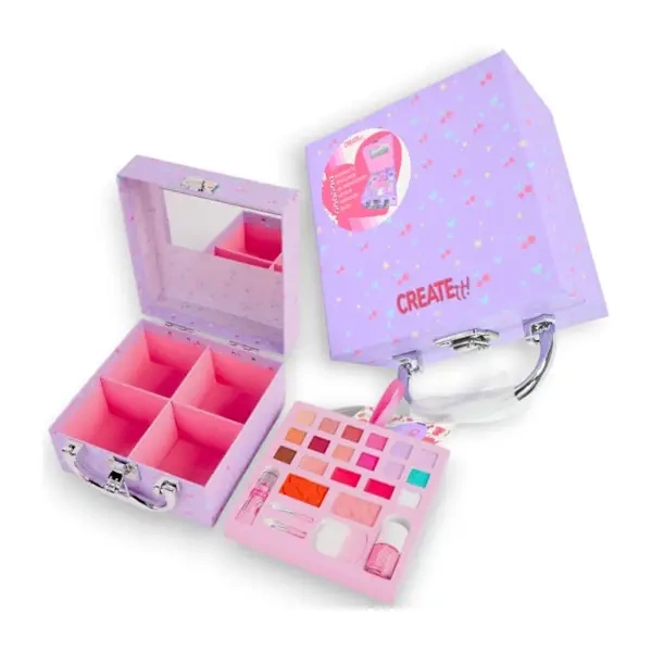 Zestaw kosmetyczny Create It! Zawiera walizeczkę-kuferek z kompletacją makijażu – m.in. cienie, błyszczyki, pędzelki, lakier do paznokci – idealny na kreatywną zabawę stylizacją. Walizeczka ma rączkę, zamek i lusterko w pokrywie