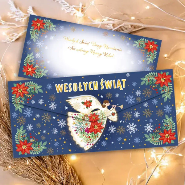 Ozdobna koperta na pieniądze, złocona i tłoczona. W zestawie wkładka z życzeniami.