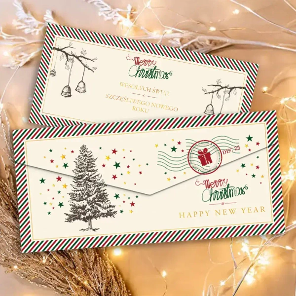 Ozdobna koperta na pieniądze, złocona i tłoczona. W zestawie wkładka z życzeniami.