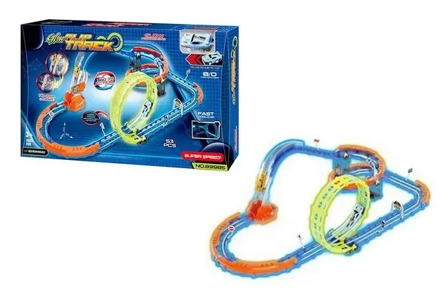 53 części. auto spuszcza się ze schodów, tor świeci w ciemności, elektryczny samochód