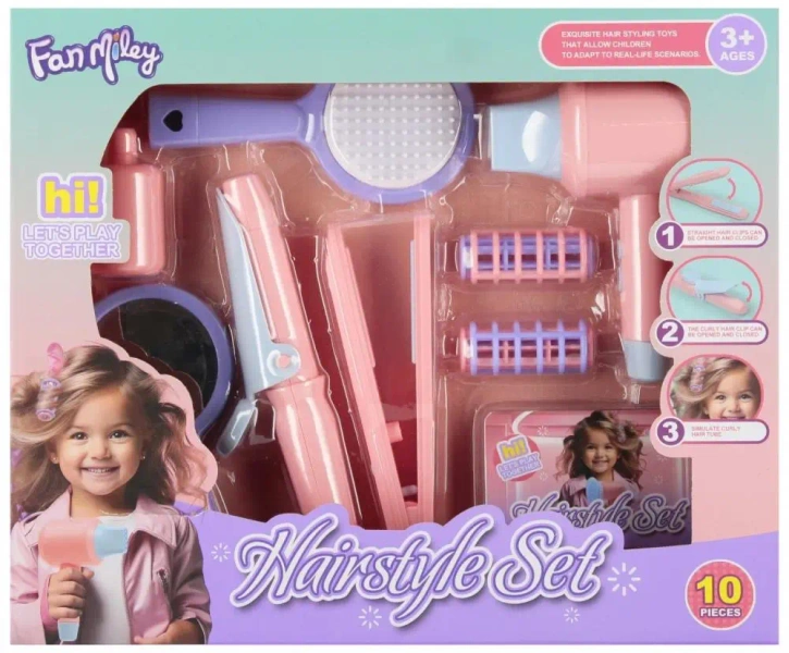 Zawartość zestawu: suszarka do włosów, lusterko, szczotka do włosów, lokówka, prostownica, wałki.