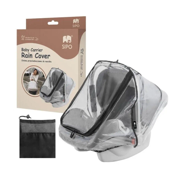 Osłona przeciwdeszczowa SIPO została opracowana z myślą o pełnej ochronie dziecka noszonego w nosidle lub foteliku samochodowym. Produkt wykonano z wysokiej jakości tworzywa EVA - materiału nie zawierającego PVC, wolnego od zapachu, o wysokiej elastyczności, odporności na zginanie oraz działanie wilgoci i niskich temperatur. Przezroczysta konstrukcja osłony pozwala na stały kontakt wzrokowy z dzieckiem i nie ogranicza widoczności. Duży rozmiar (120 x 90 cm ) oraz elastyczna guma mocująca sprawiają, że produkt z łatwością dopasowuje się do większości modeli nosideł. Dzięki uniwersalnemu krojowi osłona może być używana zarówno z nosidłami montowanymi na stelażach wózków oraz tymi przenoszonymi w ręce.
