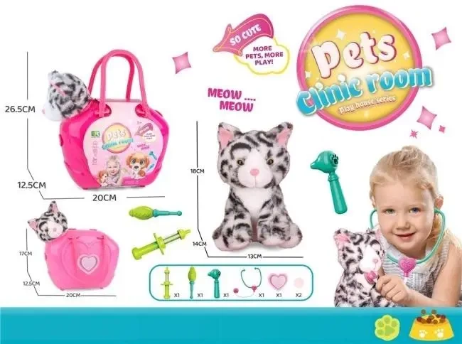 Wejdź do świata opieki nad zwierzętami z zestawem Pets Clinic Room z serii Play House. To idealna zabawka dla dzieci, które kochają zwierzęta i marzą o byciu weterynarzem. Zestaw zawiera uroczą, różową torebkę, która pełni funkcję przenośnej kliniki, oraz ślicznego, pluszowego kotka w biało-szare paski, który ma około 18 centymetrów wysokości. W komplecie znajdują się również niezbędne narzędzia małego weterynarza, w tym stetoskop, strzykawka, otoskop i inne akcesoria. Zabawka jest odpowiednia dla dzieci w wieku 3 lat i starszych. Zabawa tym zestawem rozwija empatię, umiejętności społeczne i wyobraźnię, jednocześnie ucząc dzieci odpowiedzialności za zwierzęta. Torebka ma wymiary około 26.5 cm wysokości i 20 cm szerokości, co ułatwia przenoszenie. Własna klinika dla zwierząt jest gotowa do otwarcia.