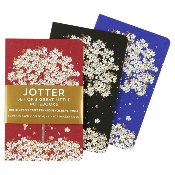 Zestaw trzech szytych notesów z serii Jotter marki Peter Pauper Press. W skład zestawu wchodzą 3 notesiki w kieszonkowym rozmiarze, każdy z okładką przedstawiającą ten sam motyw, ale w innej kolorystyce.