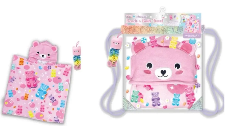 Ręcznik kąpielowy w stylu poncho z ozdobnym kapturkiem, zapakowany w przezroczysty plażowy plecaczek.