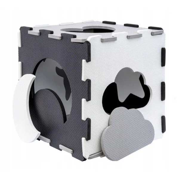 Elementy maty można dowolnie łączyć, tworząc zarówno miękką przestrzeń do zabawy na podłodze, jak i przestrzenną kostkę. Taki sześcian nie tylko bawi, ale także uczy rozwija motorykę i koordynację rękaoko. Mata jest wykonana z miękkiej, bezzapachowej pianki bez szkodliwych substancji (bez BPA, ftalanów i formamidu), bezpiecznej dla dzieci.